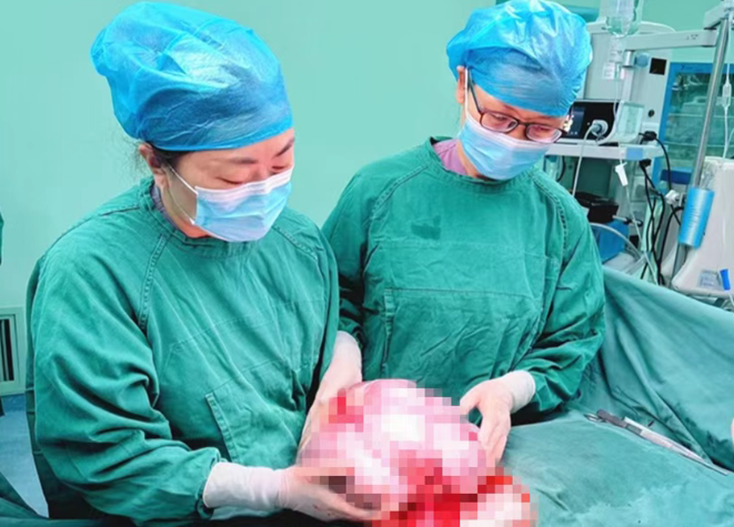 病理結(jié)果回報(bào)為 “交界性漿液性腫瘤”,龔萍教授當(dāng)機(jī)立斷,決定行全子宮切除術(shù) + 雙側(cè)卵巢及輸卵管切除術(shù) + 大網(wǎng)膜切除術(shù) + 盆腔淋巴結(jié)切除術(shù)。她憑借熟練的操作技巧和精準(zhǔn)的判斷,最終完整取出直徑約 25 厘米、重達(dá) 12 斤的腫瘤。術(shù)后,在醫(yī)護(hù)人員的精心照料下,張阿姨恢復(fù)良好。